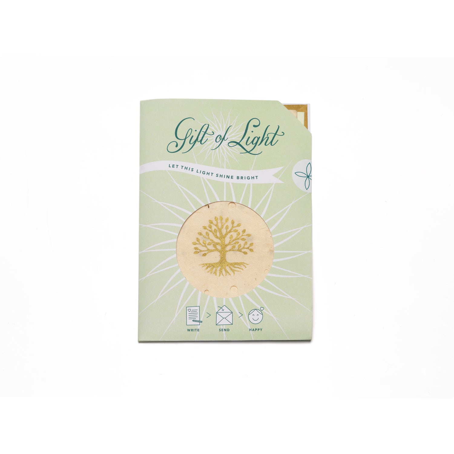 Hét brievenbuscadeautje voor iemand die je lief is. Deze Gift of Light is met passie in Nepal gemaakt van handgeschept papier en voorzien van een levensboom in sprankelend goud. De levensboom symboliseert groei en kracht.