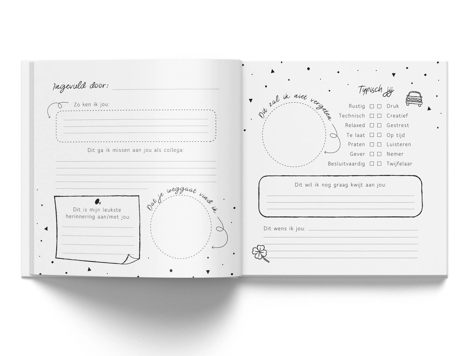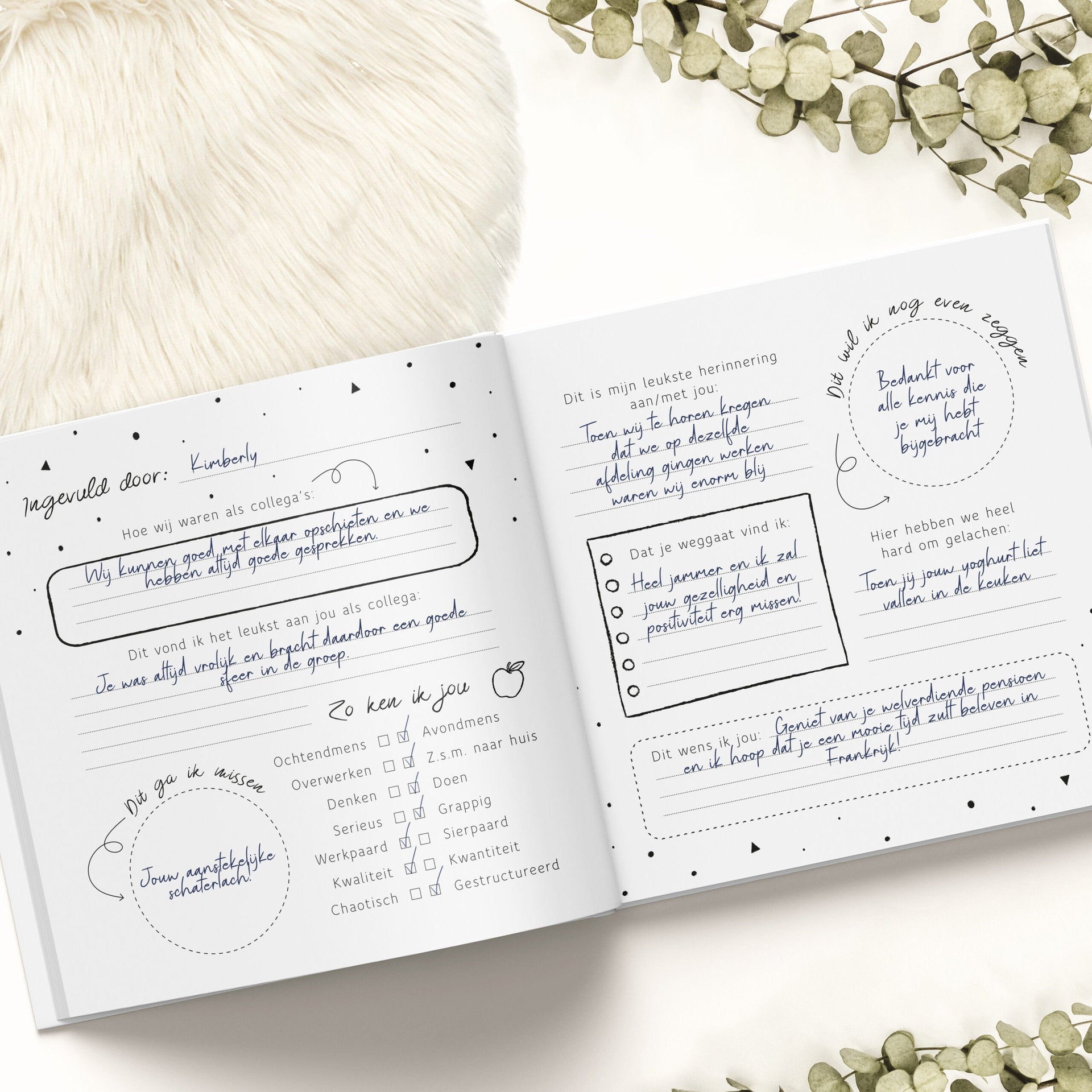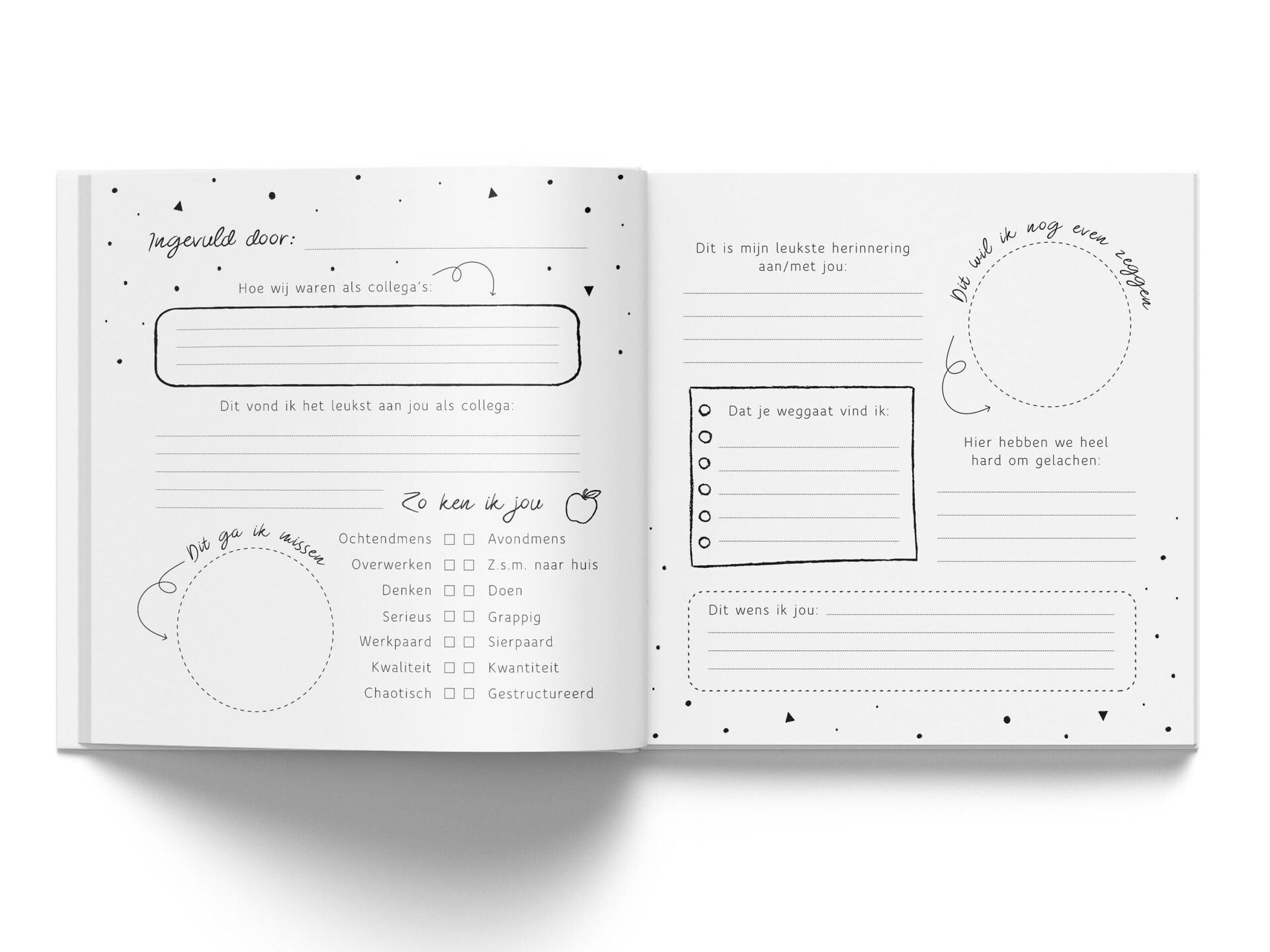 Dit cadeau heeft echt inhoud, doordat iedereen vragen in kan vullen over de persoon die afscheid neemt. Ook is er ruimte voor dierbare foto's, tekeningen of mooie quotes. Verder kun je je persoonlijke boodschap en wens voor de afscheidnemende persoon op een mooie en lieve manier kwijt. Soms is het namelijk lastig om dit te verwoorden op het moment dat hij of zij écht afscheid neemt.