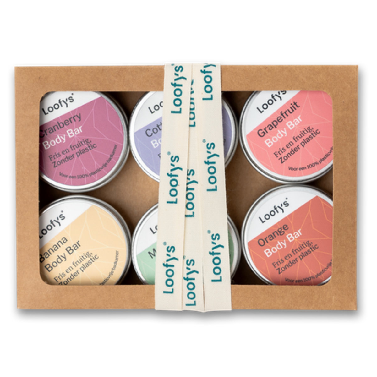 De Miniset Body Bar van Loofys bevat zes kleine bodybars (6x15 g) in diverse geuren.