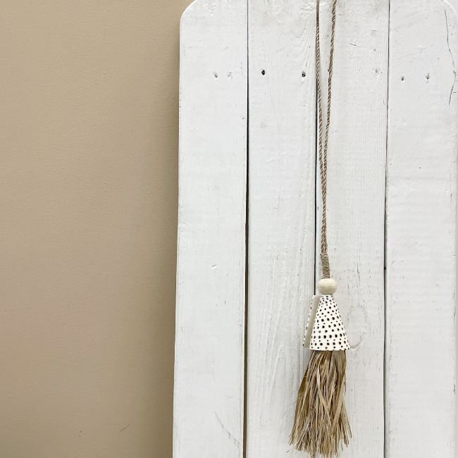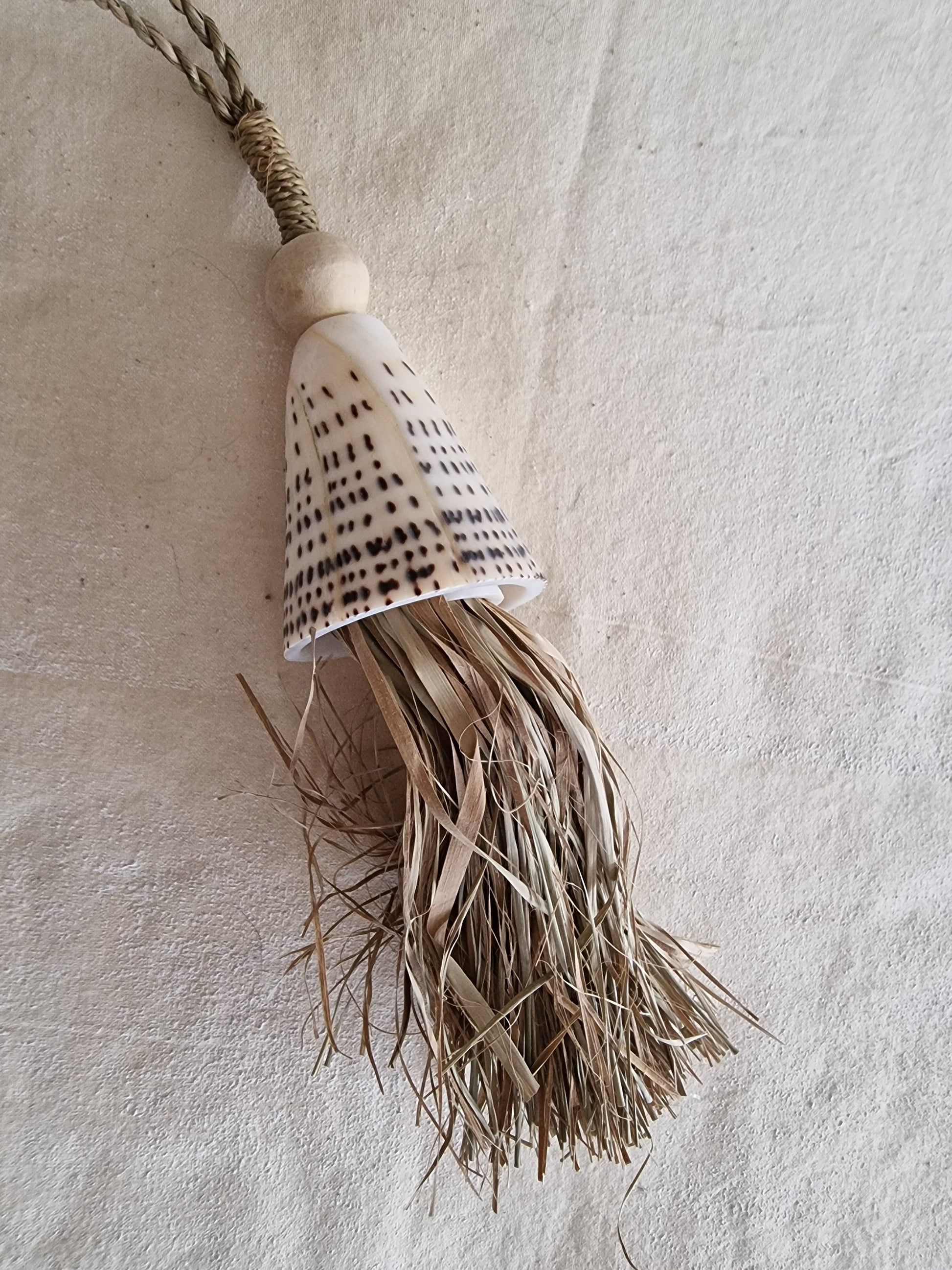 Deze hanger is gemaakt van gras in combinatie met een grote schelp en is geschikt om binnen op te hanger.